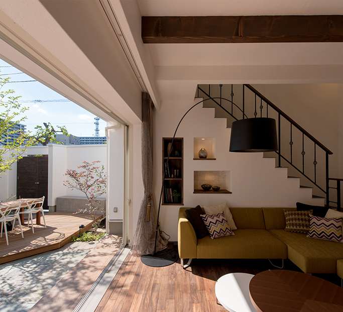 大開口で自然と繋がるリビング、中庭から室内へと続く豊かな自然光。