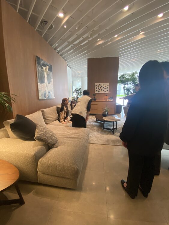 向中野モデルとリビングソファに