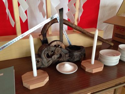 上棟式では、大工さん手作りの幣束があげられて、図面と紅白のお餅も祭壇に上がります