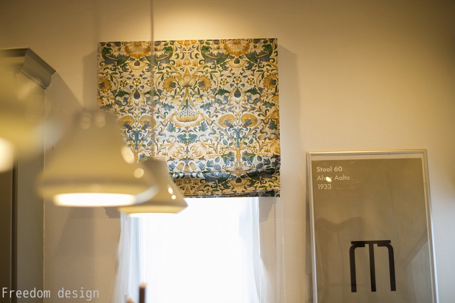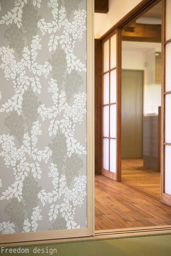 インテリアのポイントとして、英国のウィリアム・モリスのファブリック、英国のF&B社の塗装をアクセントにした家具がクラシカルさを出しています。襖や障子の一部には、同じくF&Bの紙クロスを貼り込み、柔らかな雰囲気を醸し出しております。「和」の落ち着きの中にもフリーダムデザインらしい、MIXインテリア空間のご提案です。