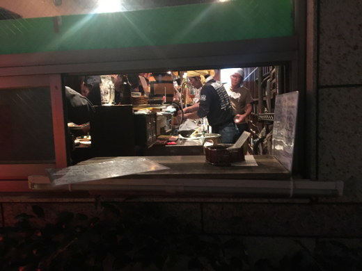 と元気に声をかけてもらって、見ると小窓の下にビール箱に板を渡した簡易テーブルを発見。