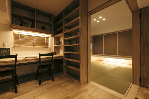和室でお子さんが眠っている姿を見守りながら、仕事にも集中できるお部屋の配置です。