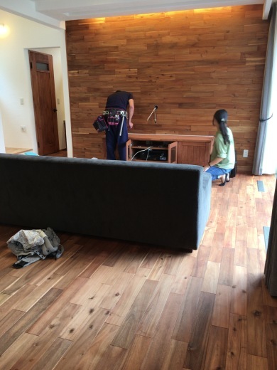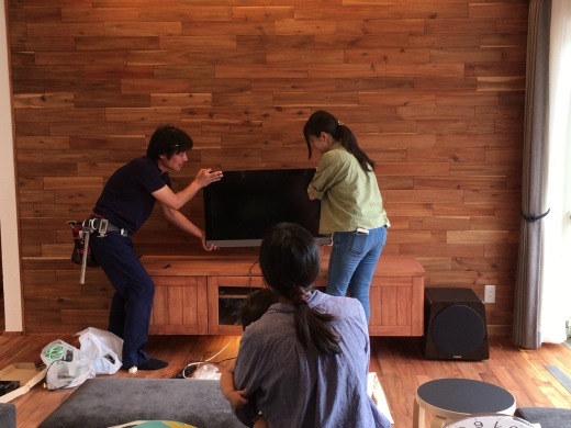 市川もテレビをもってN様にソファーに座ってもらって、高さの確認中です。