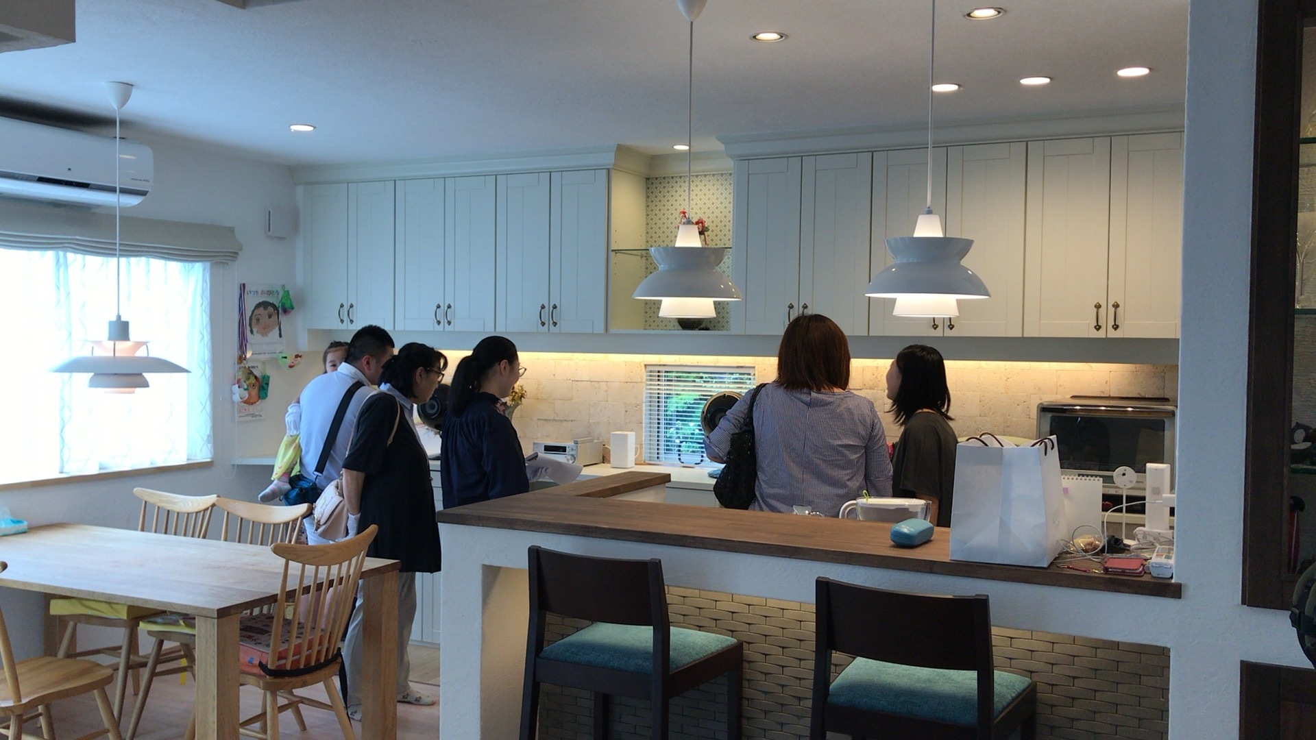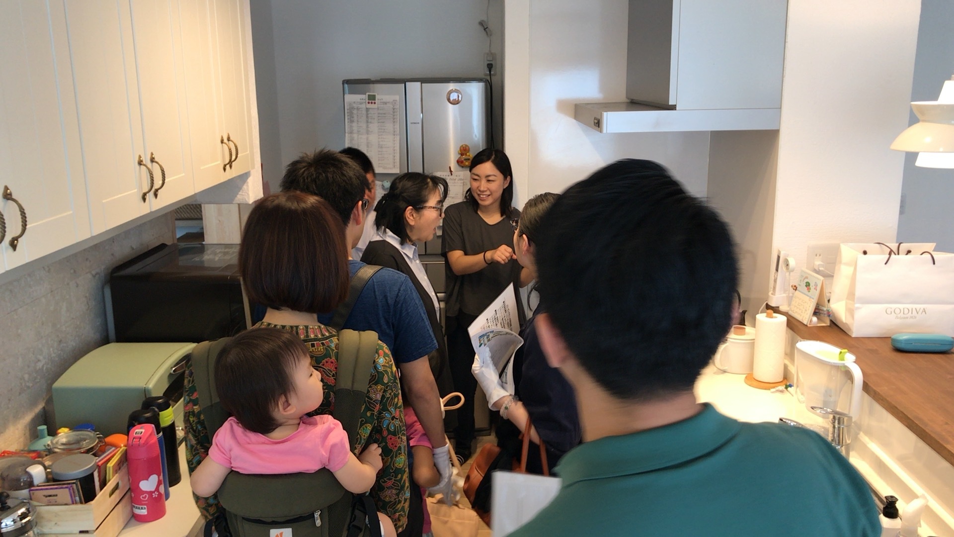 それから、お客様のご説明により建物内部をクルーズです。キッチンは、皆さんご興味を持たれる部分です。