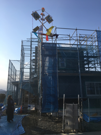 S様の上棟式は、餅まきも行われました。矢羽根と五色の旗が青空に映えます。