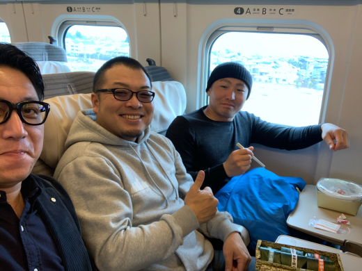 新幹線で駅弁タイム。ご一緒したのは、川上塗装さんで大工工事を担当しておられる島野さん。川上塗装さんでは、塗装以外にも、大工工事、板金工事などを、総合的に対応されている会社様です、すごい。