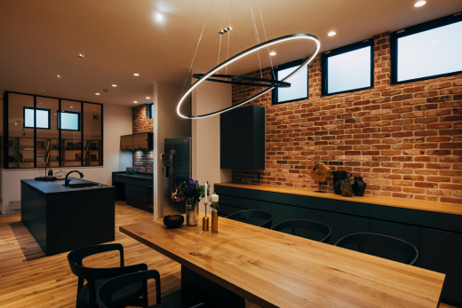 今回SE構法で設計施工させて頂いたお住まいは、海外の居住空間を思わせる天井高3,200の大空間。