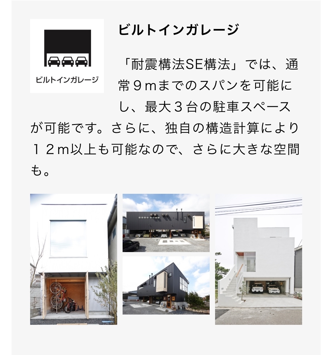 また、4〜5台駐車できる様なビルトインカーポートなども、構造的に一般在来工法では難しいのですが、SE構法なら柱無しで、3台並列にカーポートが作れます。