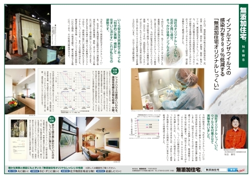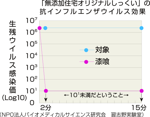弊社が使用している「無添加住宅オリジナルしっくい」はインフルエンザウイルスを99.9%低減する効果があります。