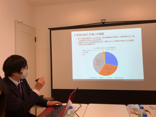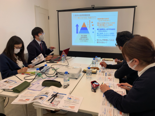 プレゼンしてもらっているのは、今後マニュアル通りに現場が合致しているか検査をして頂く第三者検査員のHさんです。
