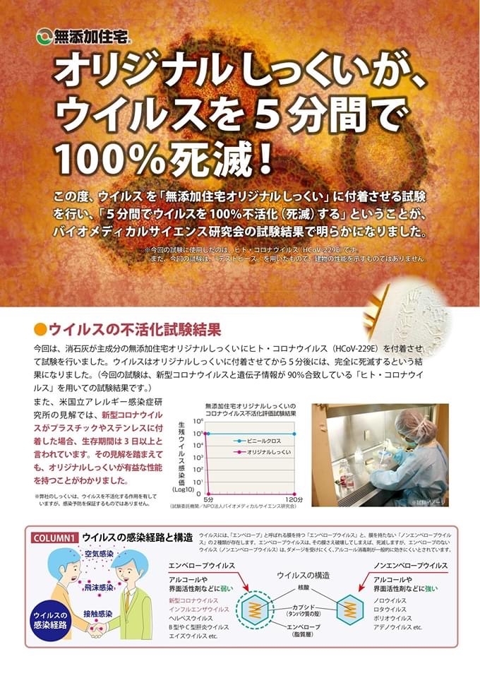 この度、 ヒト・コロナウイルス(HCoV-229E)を「無添加住宅オリジナルしっくい」に付着させる試験を行い、「5分間でヒト・コロナウイルスを100%不活化(死滅)する」ということが、バイオメディカルサイエンス研究会の試験結果で明らかになりました。