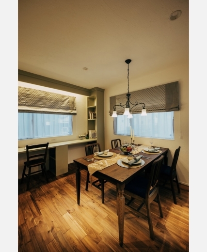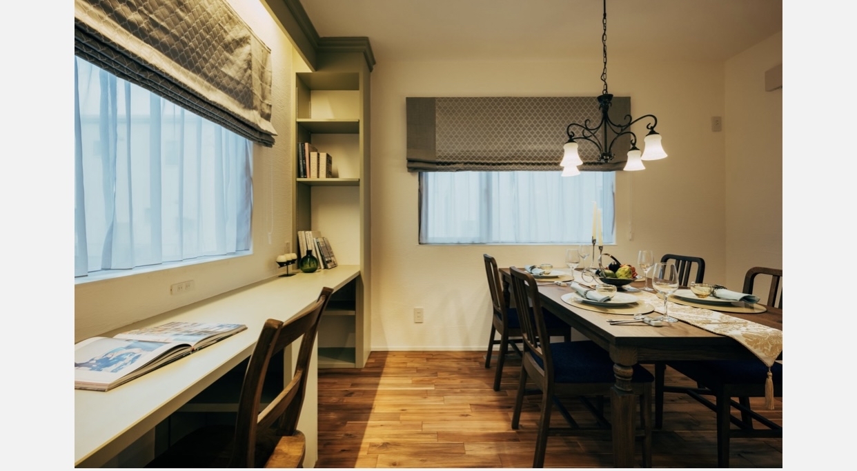 東の朝陽をたっぷり浴びて朝食が取れるダイニングです。お子様お二人が並んで勉強できるデスクカウンターも配置されています↓↓↓