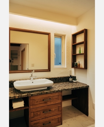 当初から、水廻りの充実を大切にお考えでした。洗面コーナーには、洗面ボウル横にお化粧できる様なカウンター部をご用意されています。
