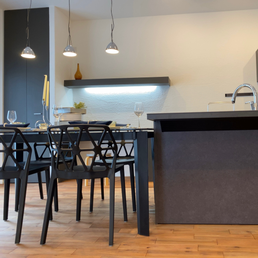 今回は、漆喰の白、キッチン家具のブラック、木部のオーク色のバランスが印象的です↓↓↓