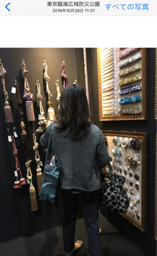 ICさちこ専務が、カーテンタッセルを物色中。JAPANTEXは国内最大のインテリアとファブリック布の見本市です。