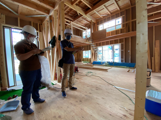 盛んに大工工事中の現場は、材料や道具などが室内に置かれていますが、ゴミ箱の設置や、転落防止などの安全対策を「現場スタンダード」に適合しているかを確認を受けます。