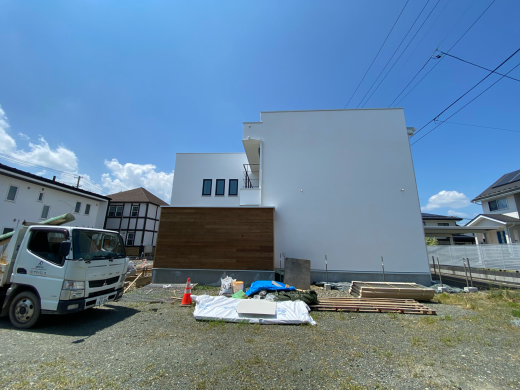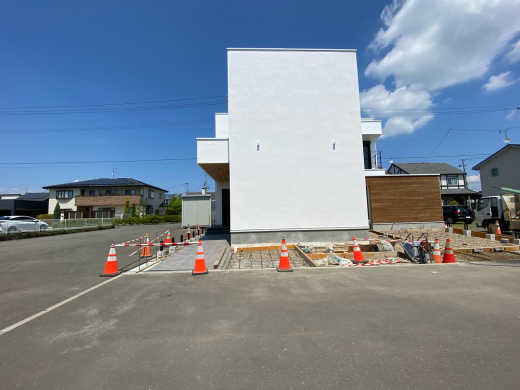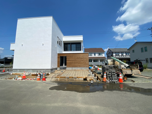 酷暑の中を、モデルハウスの外構工事進行中です。