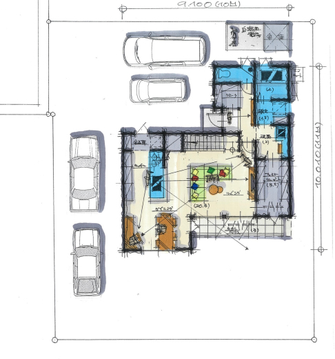 ゾーニング計画の打ち合わせでは、この様にL型に駐車場計画をご提案しました。