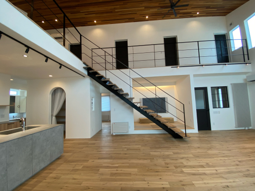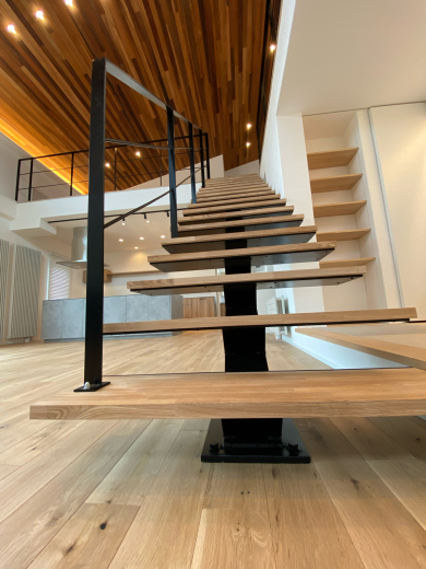 今回は、ささら(階段側面の側板)がなく、真ん中に鉄骨H型鋼を構造体にした製作階段↓↓↓