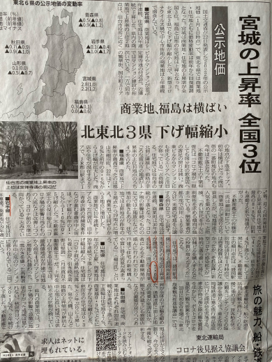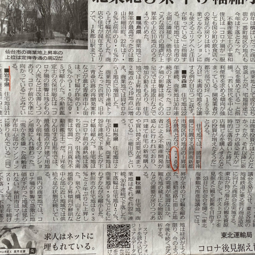 新聞記事を読む限り、宮城エリアは更にヒートアップしていると思います。建売住宅のシェアがすごい、とも聞きますが、そんな状況が更に地価高騰を招いているのかも知れません。