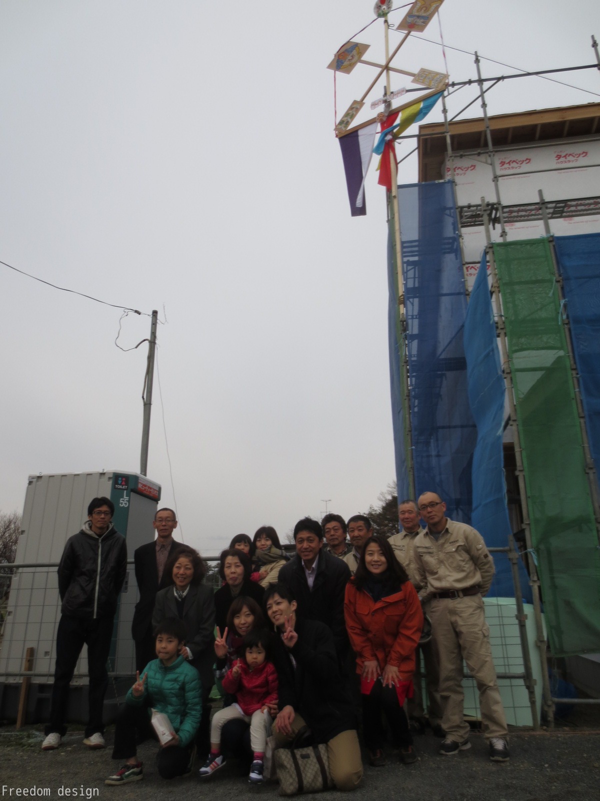 お客様Aさまご家族、私共フリーダムデザインスタッフ、棟梁はじめ大工さんたち、