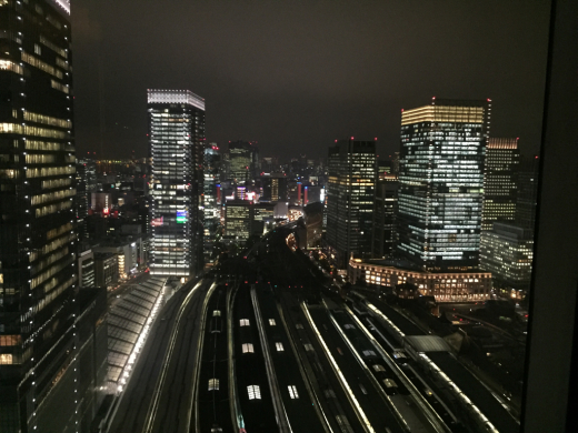 東京駅上のホテルから、新幹線のホーム上の眺め。ここだけ視界が抜けて、ちょっと珍しい感じで撮影。