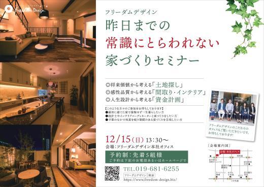 ■日時:12/15(日)13:30~会場:フリーダムデザイン本社オフィス定員:先着5組予約:お電話(019-681-6255)又は、ホームページでお申し込みください。