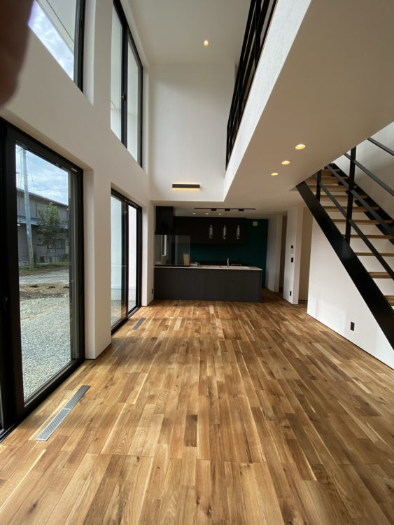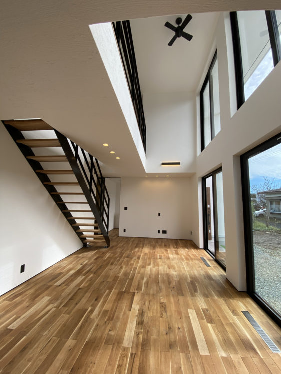 こちらのお住まいは、SE構法で耐震設計していますので、こんなに大きな吹抜け+大きな開口部でも安心して住めるお住まいです。