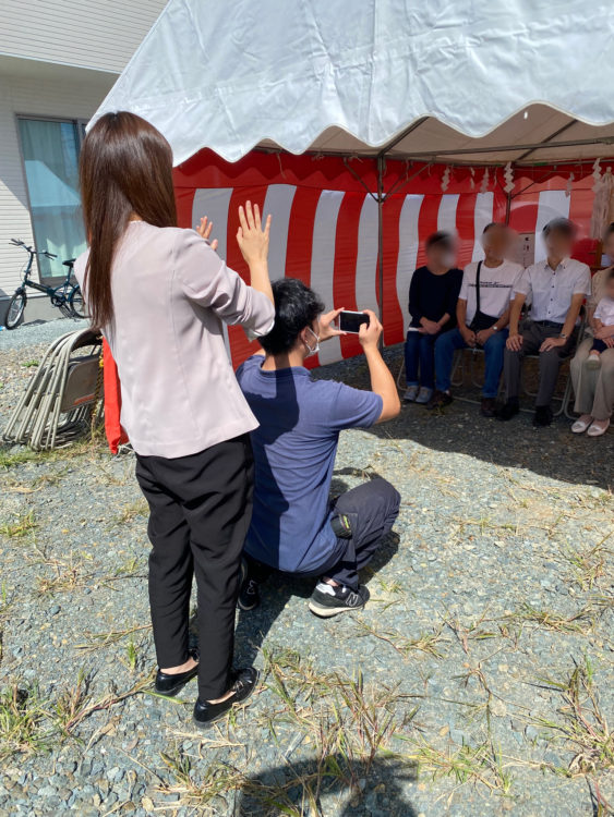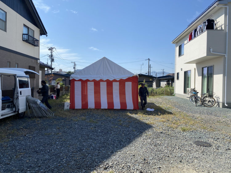 11月終盤に着工したいとお忙しい中、時間を作って頂いております。 台風の影響で雨が降っていたのですが、式が始まると雨も止み、前途を応援されている様に思いました。