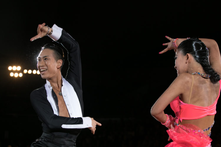 競技会や発表会のシーンでは、男性は燕尾服、女性はロングドレスを着用して踊ることが多いです。