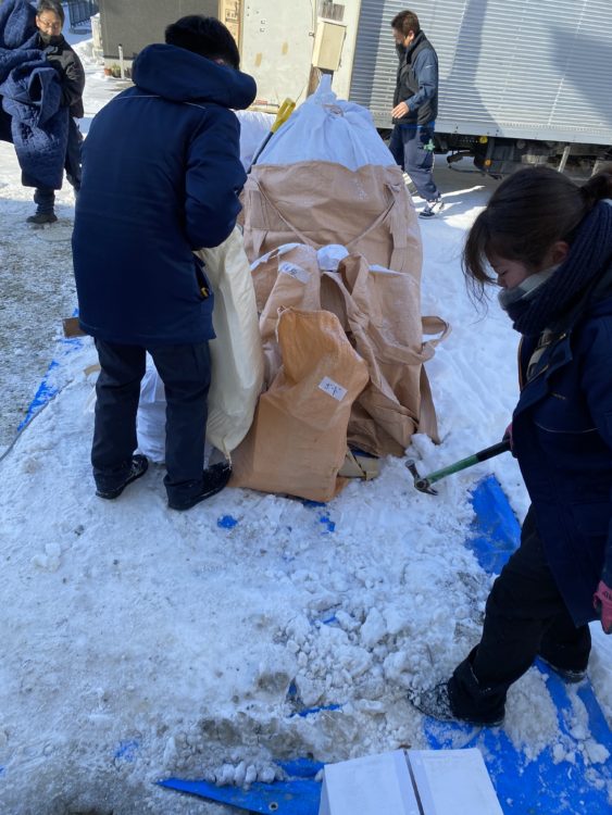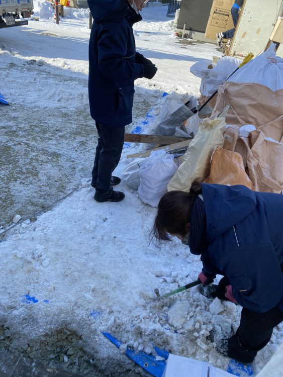 寒さの中、一生懸命除雪している社員を