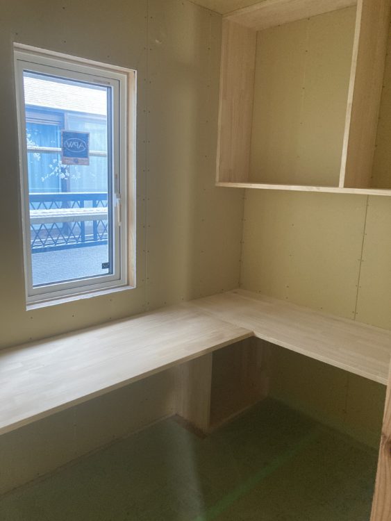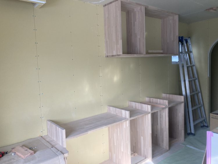 現在大工工事中で、カウンターやカップボートの造作工事です。