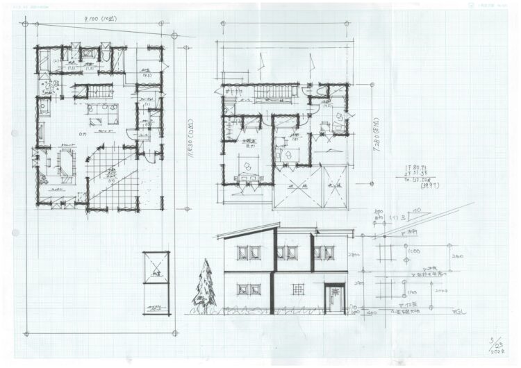 今回トレースしたプランは約40坪のプランです。社長には立面を描く際に、基準となる高さを横に書いてから立面図を描くように教えていただきました。